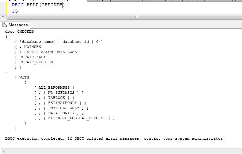 DBCC HELP(<dbcc command>).It displays the syntax of a DBCC command.