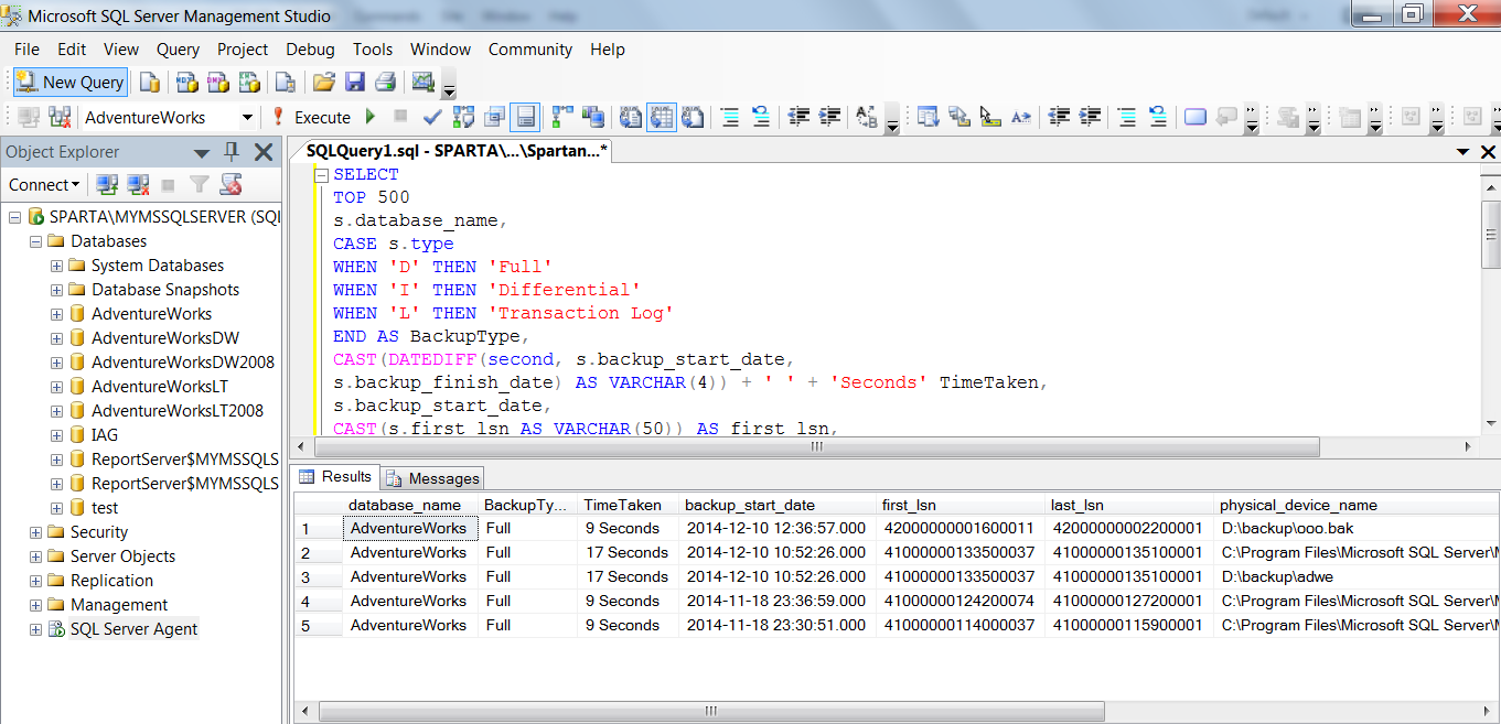 s.backup_finish_date) AS VARCHAR(4)) + ' ' + 'Seconds' TimeTaken,